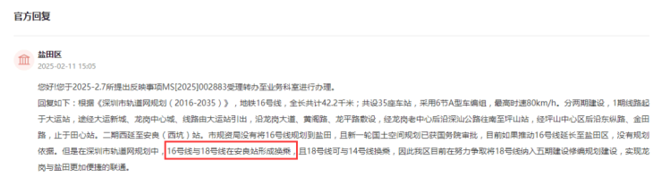 官方回复:没有规划依据将16号线延长至盐田区。