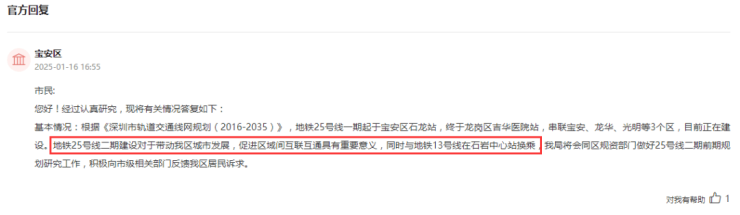 有关部门在回复中提及,地铁25号线二期建设对于带动我区城市发展,促进区域间互联互通具有重要意义,同时与地铁13号线在石岩中心站换乘。