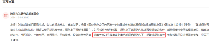 官方回复:统筹考虑21号线南山到南坑或深朗段纳入下一期建设规划。