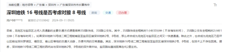 因此,有网友在领导留言板建言求助,16号线能否南延至盐田?也有网友建议,是否考虑16号线对接8号线?