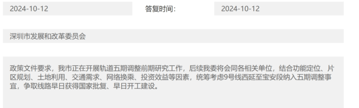 去年10月份,发改委在回复网友咨询时提到,“统筹考虑9号线西延至宝安段纳入五期调整事宜”。