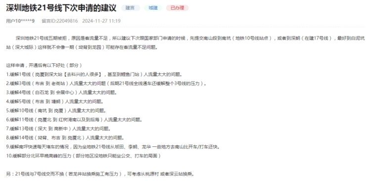 Q:深圳地铁21号线下次申请的建议