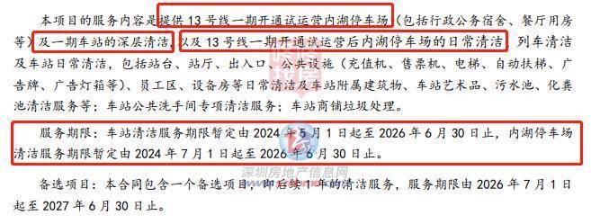 公告显示,本项目的服务内容是提供13号线一期开通试运营内湖停车场及一期车站的深层清洁及日常清洁等。而服务期限暂定车站清洁服务从2024年5月1日到2026年6月30日止,内湖停车场从2024年7月1日到2026年6月30日止。