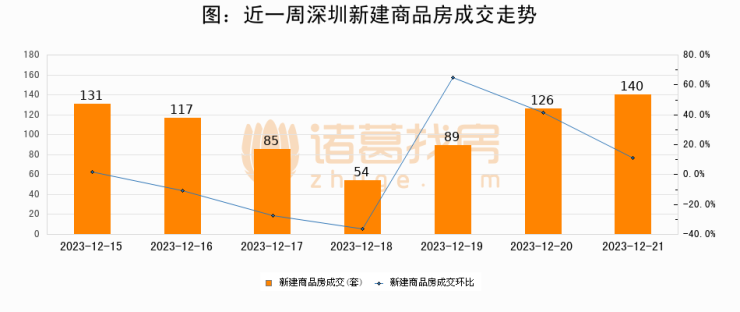 根据深圳市住房和城乡建设局数据显示,2023年12月21日深圳新建商品房成交140套,较昨日增加14套,环比上涨11.1%