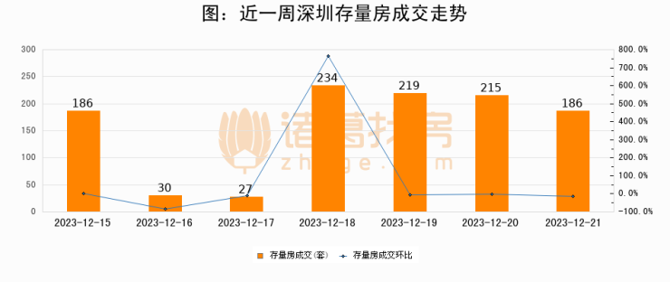 从存量房来看,2023年12月21日深圳存量房单日成交186套,比昨日减少29套,环比下降13.5%。从近一周存量房成交来看,深圳存量房日均成交套数为156套,12月21日单日成交186套,高于近一周平均水平19.2%。