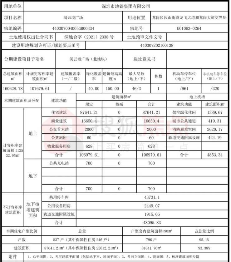 深铁阅云境广场(北地块)占面约4.6万㎡,总建面约16万㎡,计容积率建面约11.3万㎡,容积率2.46。规划停车位961个(其中公共停车位200个)。