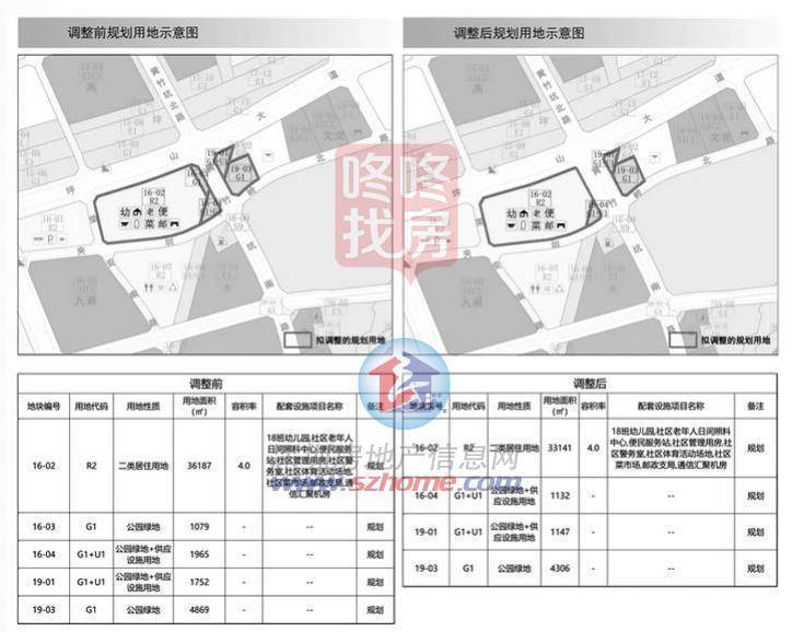 16-04、19-01地块用地面积分别调整为1132㎡、1147㎡,用地性质均为公园绿地+供应设施用地(G1+U1);