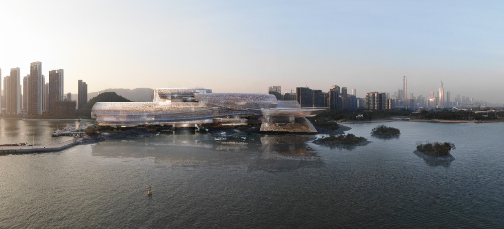 “该方案以‘海上的云’的概念,展现‘漂浮的建筑’的理念……轻柔、自由的建筑形态,与大鹏半岛独特的环境风貌紧密融合,有机连接起周边山、海、湿地和城市景观,形成陆地与海洋的有趣对话。