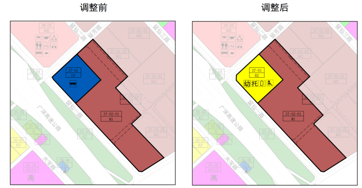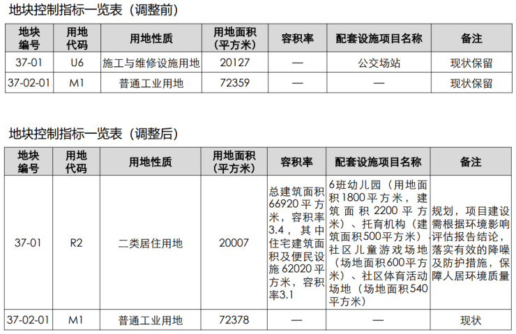 调整后,37-01地块用地性质由“施工与维修设施用地”调整为“二类居住用地”,用地面积由20127平方米调整为20007平方米,容积率由“-”调整为“总建筑面积66920平方米,容积率3.4,其中住宅建筑面积及便民设施62020平方米,容积率3.1”,配套设施由“公交场站”调整为“6班幼儿园(用地面积1800平方米,建筑面积2200平方米)、托育机构(建筑面积500平方米)、社区儿童游戏场地(场地面积600平方米)、社区体育活动场地(场地面积540平方米) ”,备注由“现状保留”调整为“规划,项目建设需根据环境影响评估报告结论,落实有效的降噪及防护措施,保障人居环境质量”。