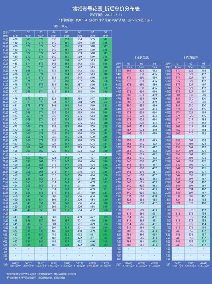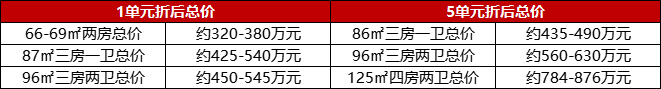 其中,1单元均价约53477元/㎡,5单元均价约62465元/㎡。折后单价约4.77万/㎡起!