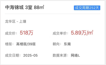 项目相邻的次新小区中海锦城二手房,88㎡3房最新成交总价约518万,成交单价约5.89万/㎡。