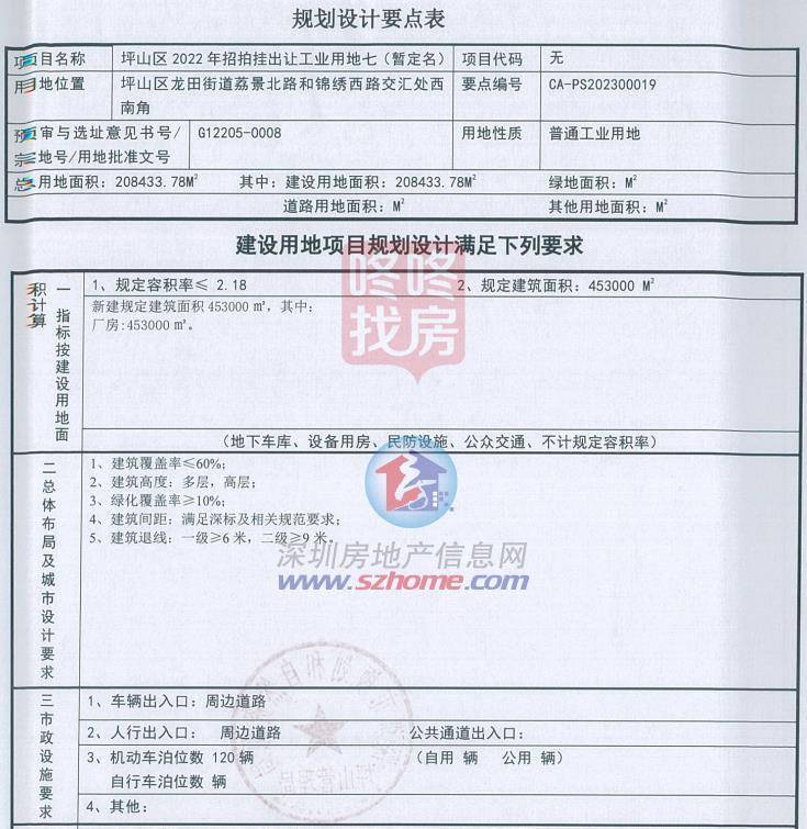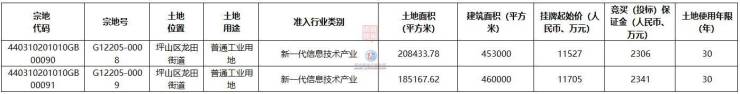 宗地号G12205-0008,土地位置坪山区龙田街道,土地用途土地用途,准入行业类别新一代信息技术产业,土地面积208433.78平方米,建筑面积453000平方米,挂牌起始价11527万元,土地使用年限30年。
