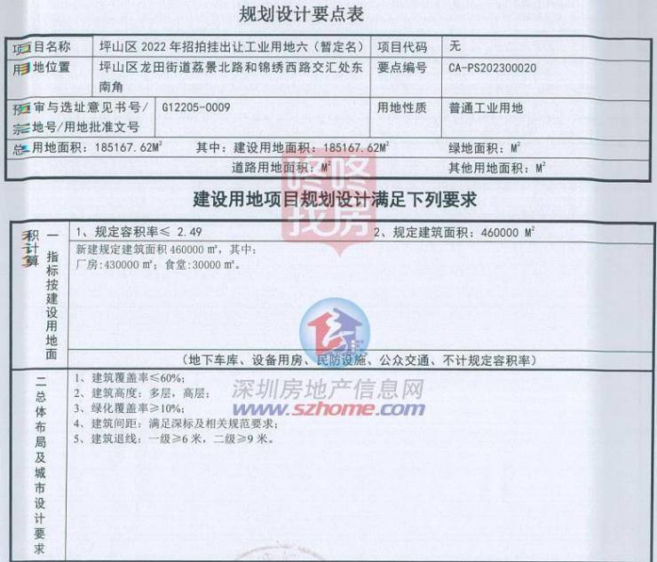宗地号G12205-0009,土地位置坪山区龙田街道,土地用途普通工业用地,准入行业类别新一代信息技术产业,土地面积185167.62平方米,建筑面积460000平方米,挂牌起始价11705万元,土地使用年限30年。