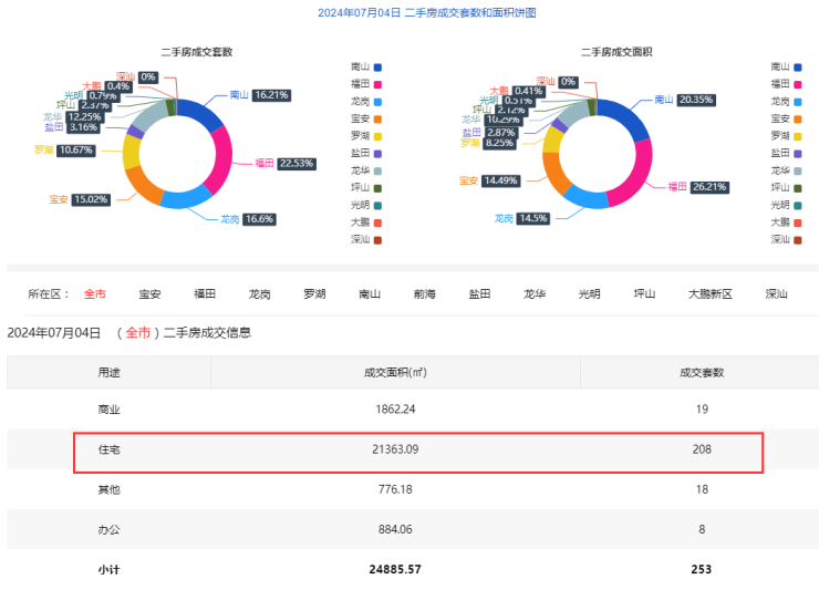 2024年7月4日二手房住宅网签208套。宝安35套;福田45套;龙岗38套;罗湖21套;南山30套;盐田6套;龙华24套;光明2套;坪山6套;大鹏1套。