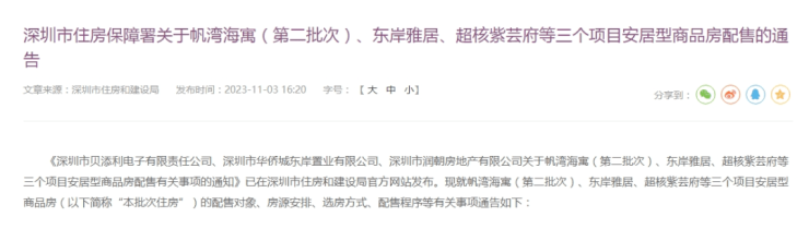刚刚,深圳市住房保障署发布了关于帆湾海寓(第二批次)、东岸雅居、超核紫芸府等三个项目安居型商品房配售的通告。