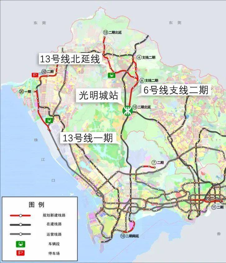 光明城站未来将打造为西北片区的交通枢纽,除了运营的广深港高铁外,目前还在建赣深高铁、地铁6号线支线、地铁13号线,并规划有深莞城际和地铁18号线(规划)等线路。