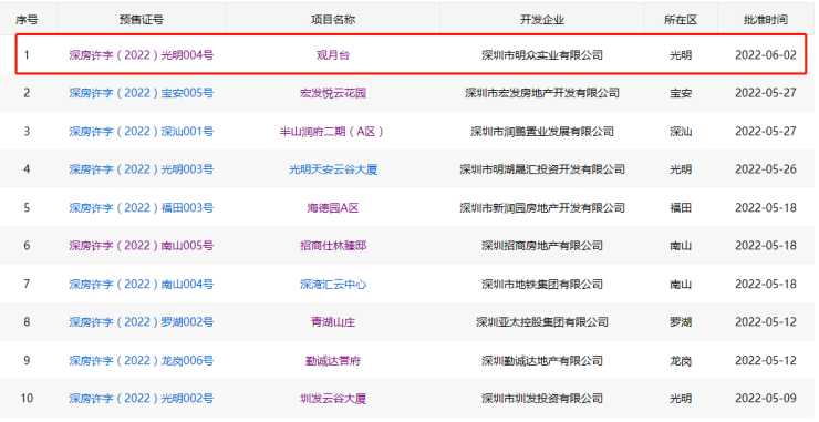 位于光明城高铁站附近的特发观月台,今日(6月2日)获得预售许可证,项目共备案359套住宅房源,户型建面段约78-108平,单价区间约4.32-5.08万/平,均价约4.69万/平,总价约337-550万/套,毛坯交付。