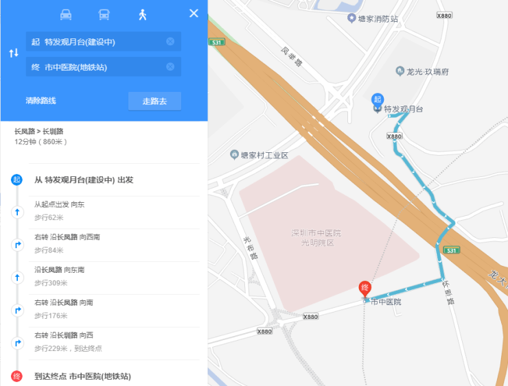 另外,在特发观月台南部,还有13号线市中医院站,根据地图测距,步行约800多米。