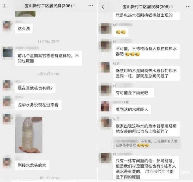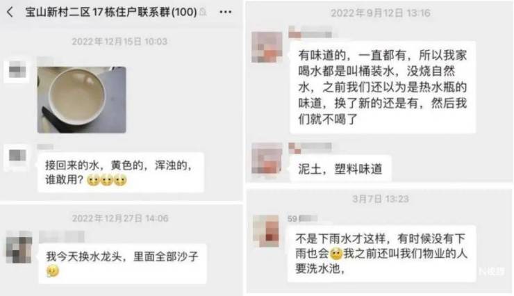 根据吴女士提供的聊天记录,2022年12月、2023年6月、2025年3月及4月,均有宝山新村二区住户在居民群里反馈家里水质出现浑浊发黄的情况,还有人称“水龙头老是被石沙堵”“水有泥土味、塑胶味”等,并且这类水质问题雨天居多。另有居民称,有时候不下雨也会出现类似的水质,即便物业清洗水箱,问题仍反复出现。