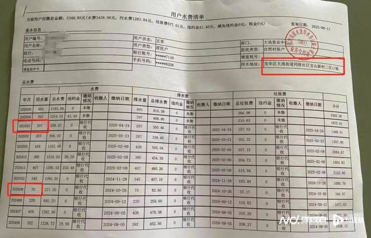 龙华区水务局提供的《用户水费清单》显示,该楼栋2024年9月用水量为70立方米。而吴女士表示,“我们收集了当月住户的水电费收据发现,仅9户的用水量已达到80立方米,远远超过官方用水数据。”另外,2025年3月官方用水量为297立方米,而住户统计的32户实际用水量为291立方米,但吴女士告知,该楼栋当月有59户。