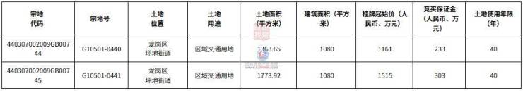 宗地号G10501-0440、G10501-0441,土地位置龙岗区坪地街道,土地用途区域交通用地,土地面积1363.65平方米、1773.92平方米,建筑面积1080平方米、1080平方米,挂牌起始价1161万元、1515万元,土地使用年限均为40年。