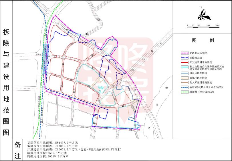 更新单元用地面积811183.4㎡,拆除范围用地面积726468.7㎡,开发建设用地面积379994.5㎡(含3000㎡零星出让土地)。