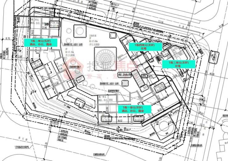 其中1栋1/2单元为办公、酒店及商业,层高50-54层;3/4单元均为33层高的住宅。