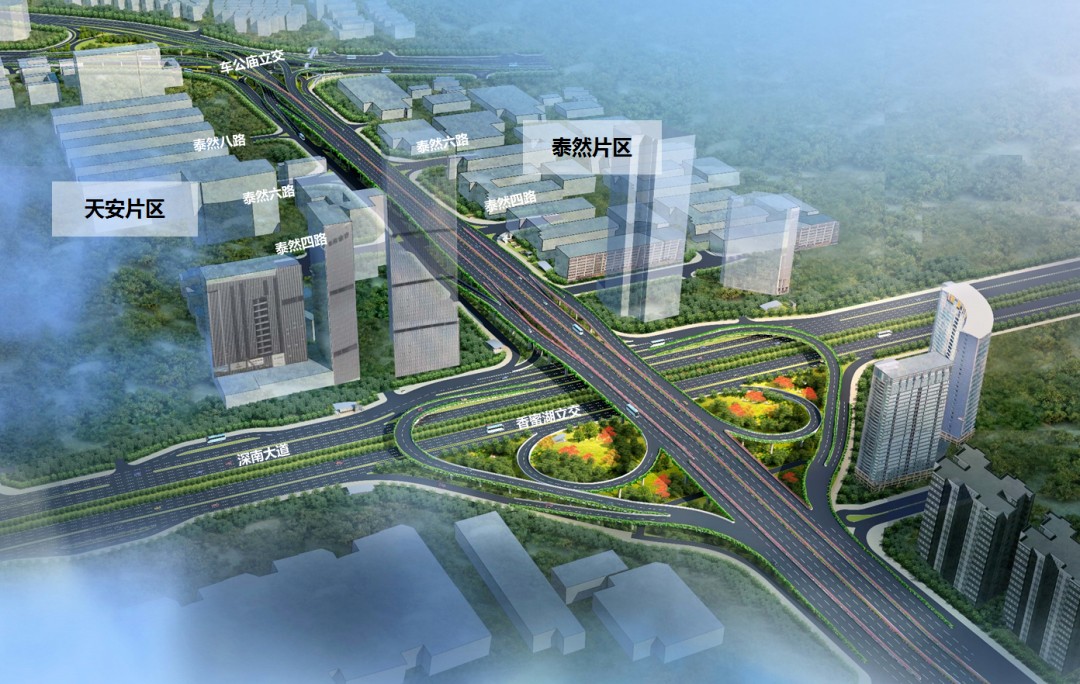 2021年7月,进行BHD匝道(滨河东转香蜜湖路主道)局部两侧防撞护栏及路缘石施工,将封闭泰然三路段一个车道,保留1车道通行。
