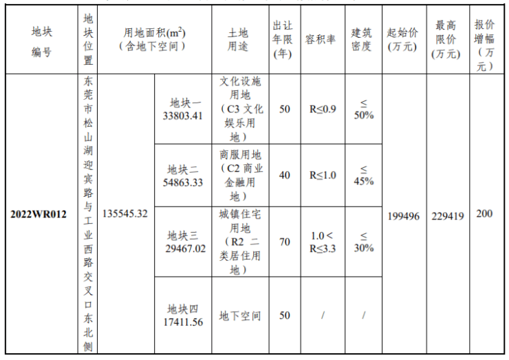 编号2022WR012地块,即松山湖创意生活城地块,位于东莞市松山湖迎宾路与工业西路交叉口东北侧,地块网上报价期限为:2022 年 6 月 13 日 9:00 至 2022 年 6 月 24 日 11:30 。