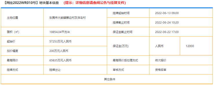 编号2022WR010地块,位于东莞市大朗镇蔡边村及洋乌村,地块网上报价期限为:2022年6月13日9:00至 2022年6月24日10:20。