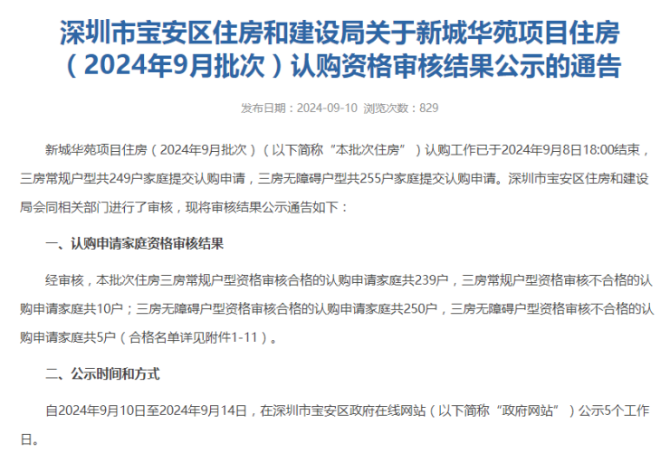9月10日,宝安住建局公示新城华苑9月批次的房源的认购资格审核结果。