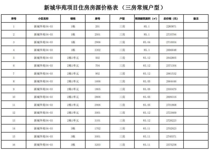 本批价格方面,三房普通户型主要分布在1栋、2栋1单元、3栋,总价区间约228.6-274万/套之间。
