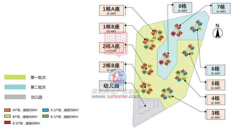 全社区共计可提供1788套住宅,包含1280套建面约69㎡两房和508套建面约89㎡三房的户型产品,均为2梯5/6户的梯户配置。