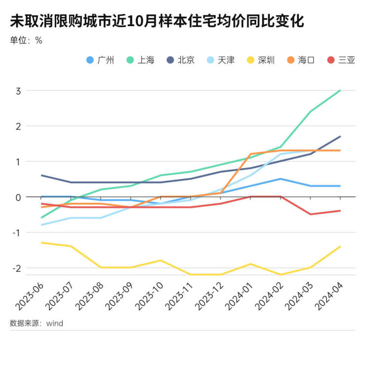 上海、北京今年以来的样本住宅平均价同比仍是正增长的。尤其是上海,今年4月房价同比增长了3%,为近10月来最大增幅。