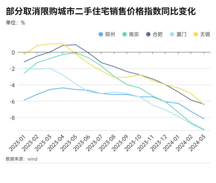 以南京、郑州、合肥、厦门、无锡等5个城市作为观察样本,可以发现,自2023年8月的取消、放松限购潮以来,这些城市的房价并没有回升。