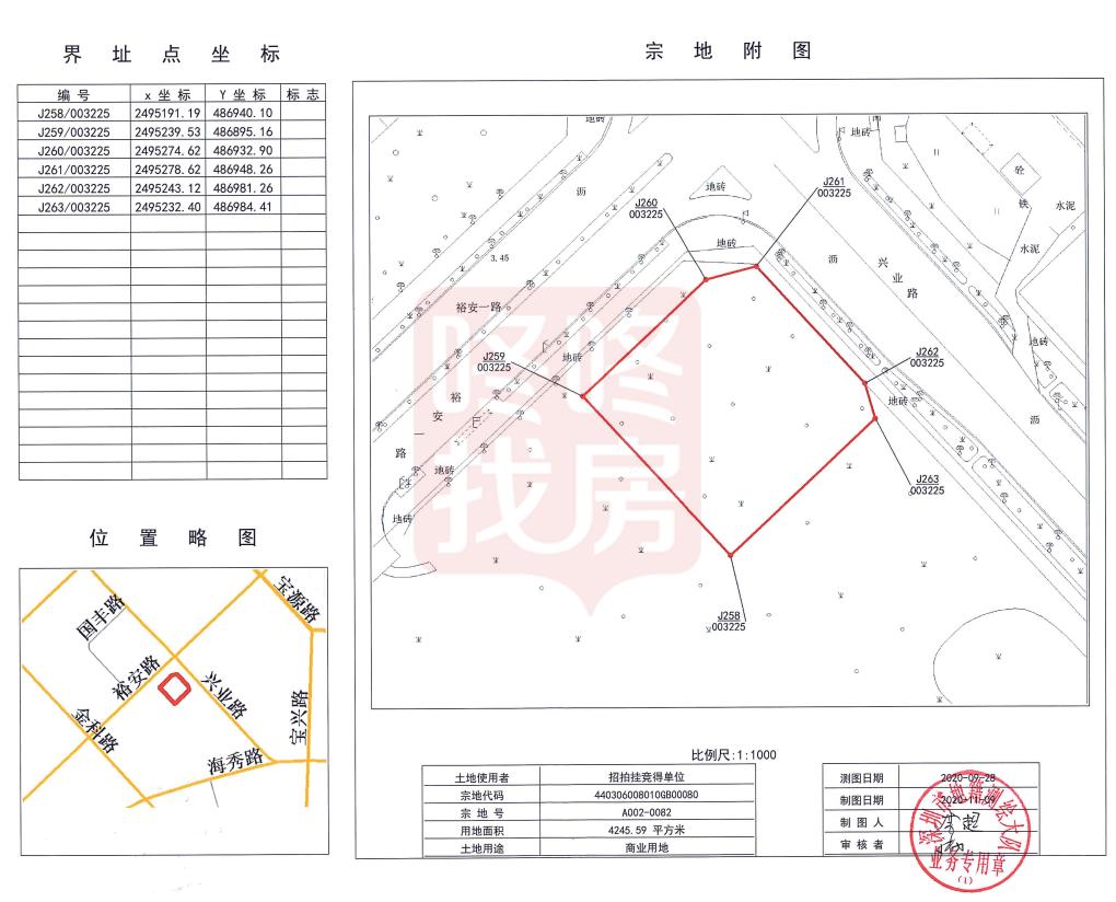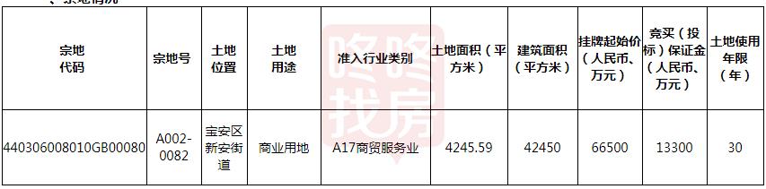 宗地号A002-0082,土地位置宝安区新安街道,土地用途商业用地,准入行业类别A17商贸服务业,土地面积4245.59平方米,建筑面积42450平方米,挂牌起始价66500万元,保证金13300万元,土地使用年限30年。
