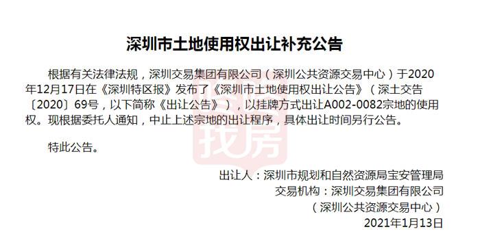 1月13日,深圳公共资源交易中心发布深圳市土地使用权出让补充公告,原定1月15日出让的宝安商地,中止出让。