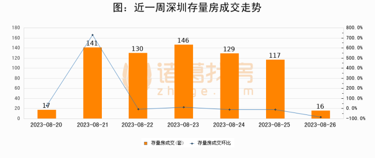 从存量房来看,2023年08月26日深圳存量房单日成交16套,比昨日减少101套,环比下降86.3%。从近一周存量房成交来看,深圳存量房日均成交套数为99套,08月26日单日成交16套,低于近一周平均水平83.8%。