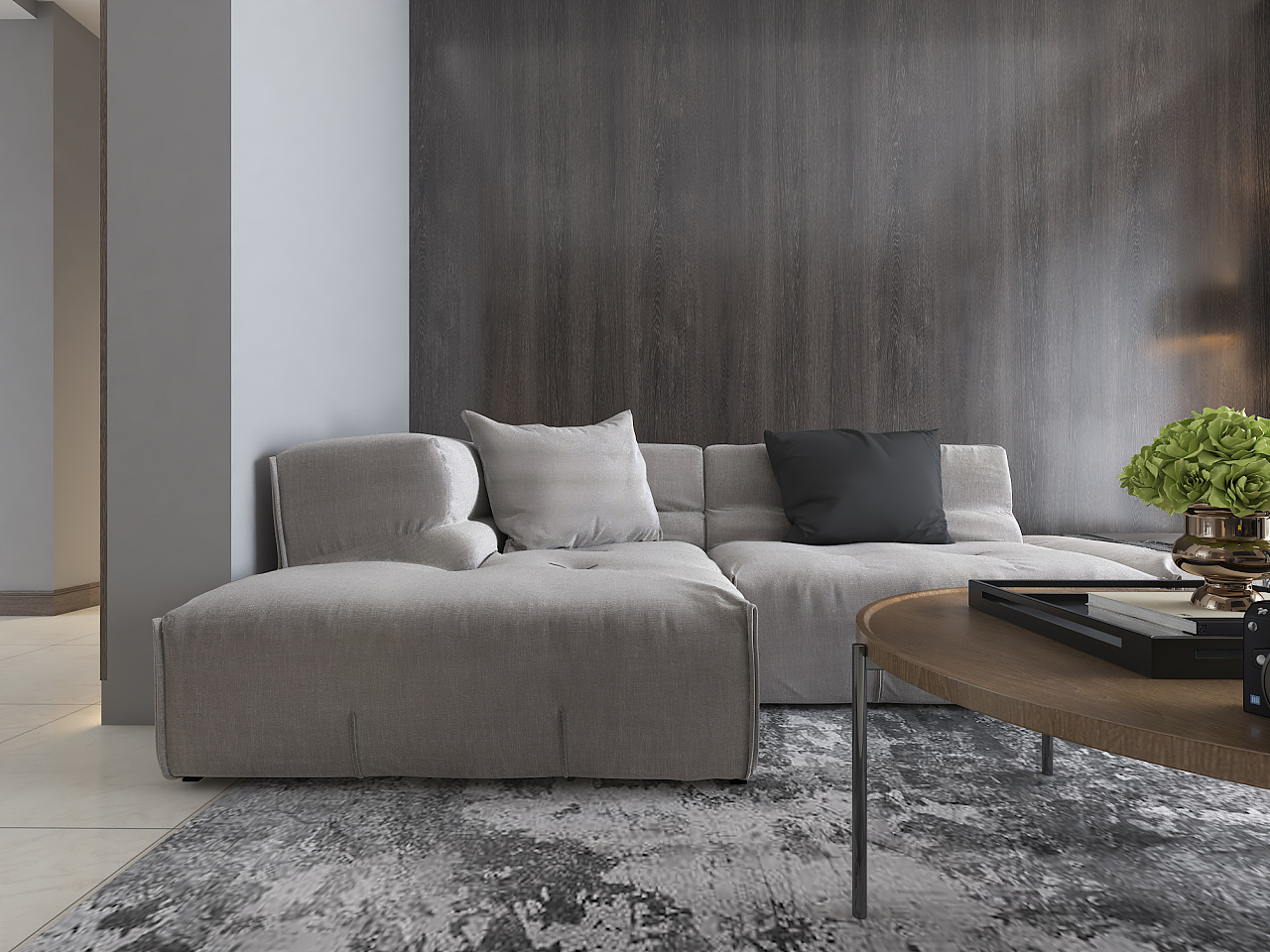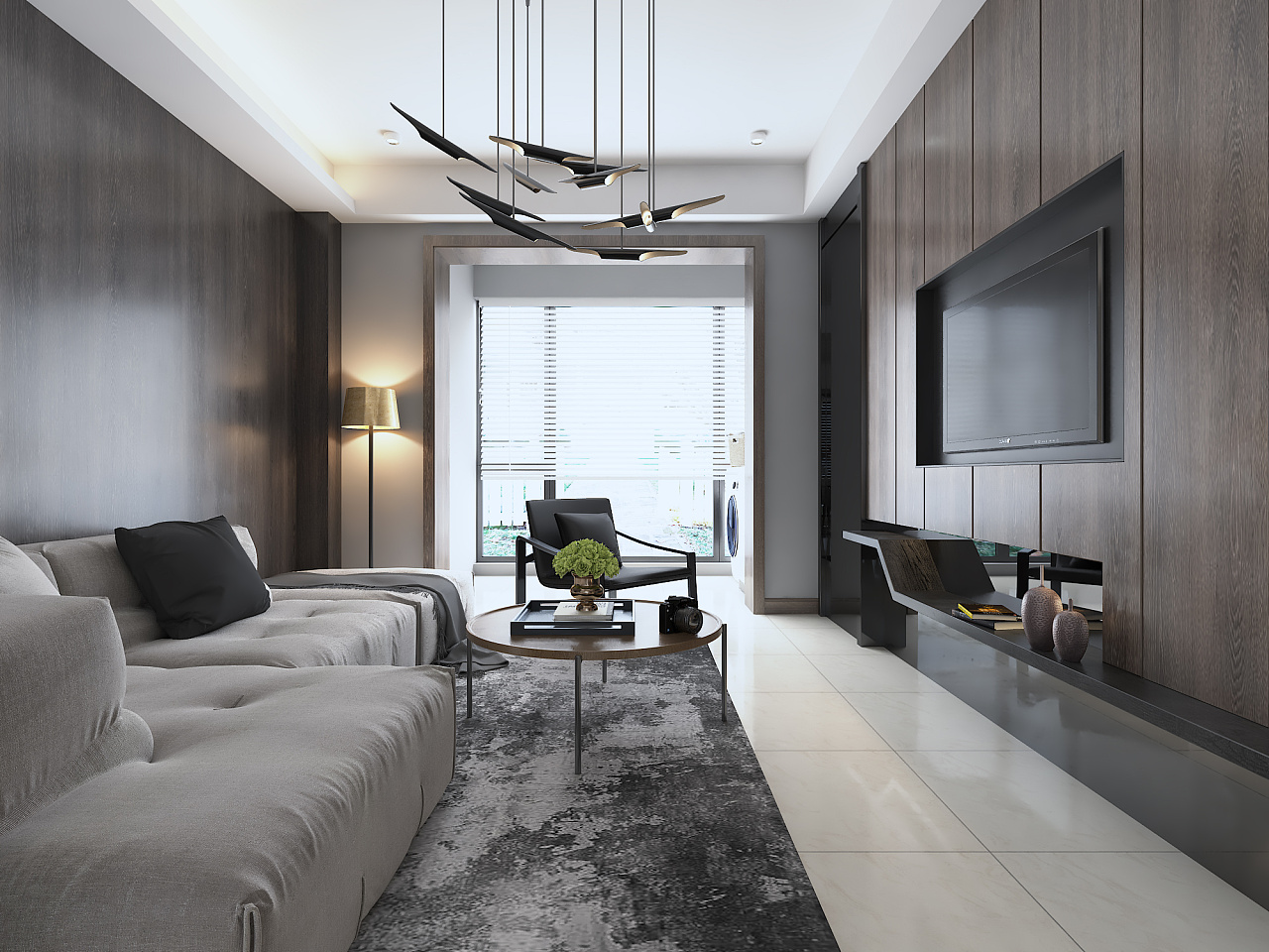 地面的淡色瓷砖搭与蓝色斑纹的地毯搭配,简约而不简单。木饰面的整体铺设作为客厅的背景墙,简练而纯粹。