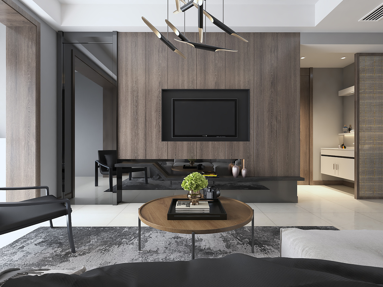 电视墙的木饰面采用了分缝的拼接手法搭配黑色烤漆的挑出台面,节奏感十足。电视墙的一侧采用了黑色暗镜,延展了客厅的空间感。