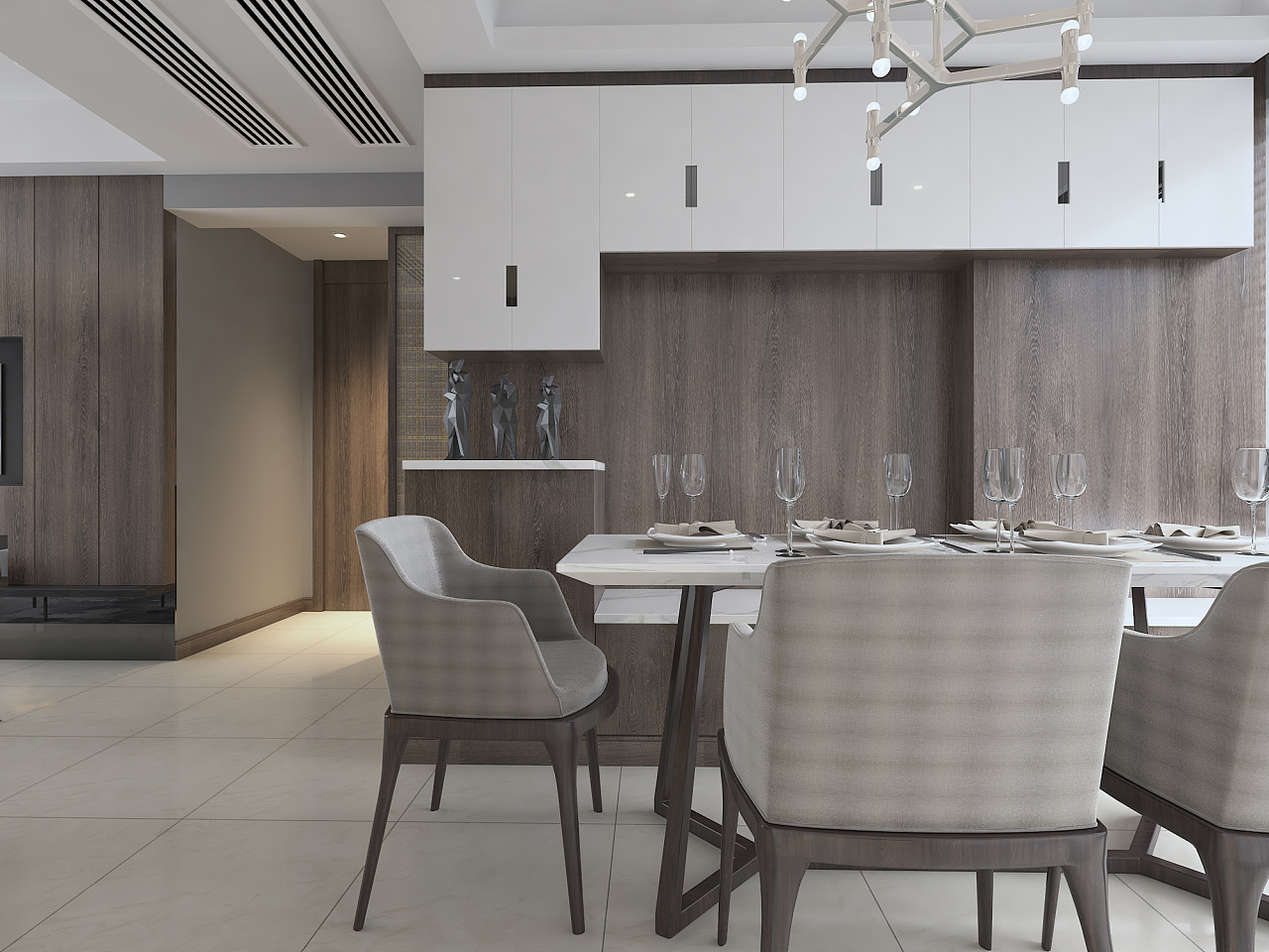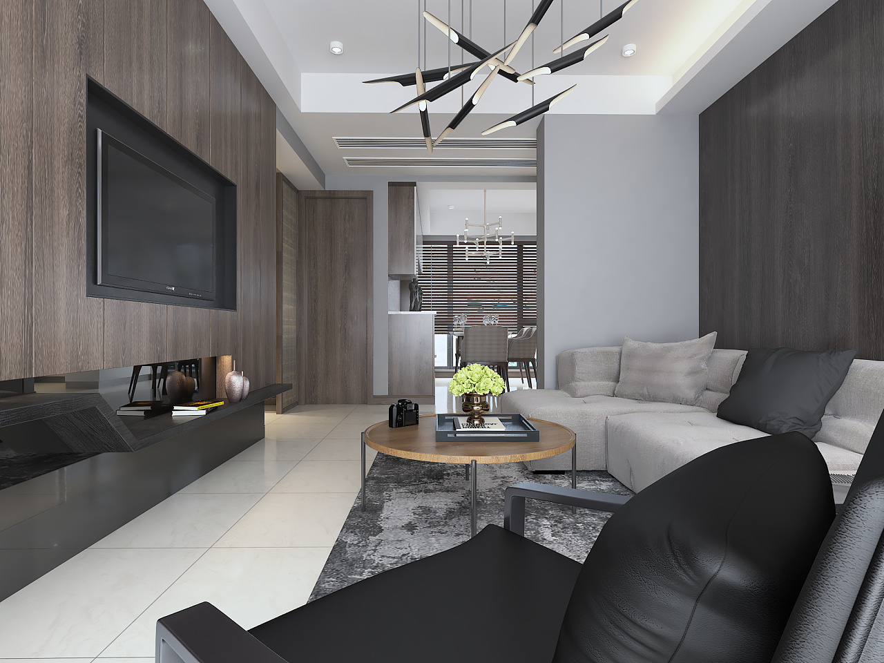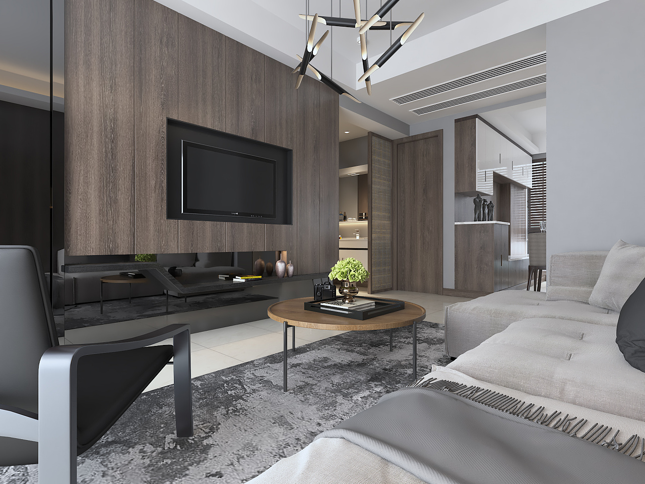 本案采用大量的KD木饰面置于墙身,加上淡灰色的沙发和极有设计感的座椅,配上金属桌角的茶几,最后搭上淡色的瓷砖作为地面铺设,木质温馨并富有现代感的家展现在眼前。