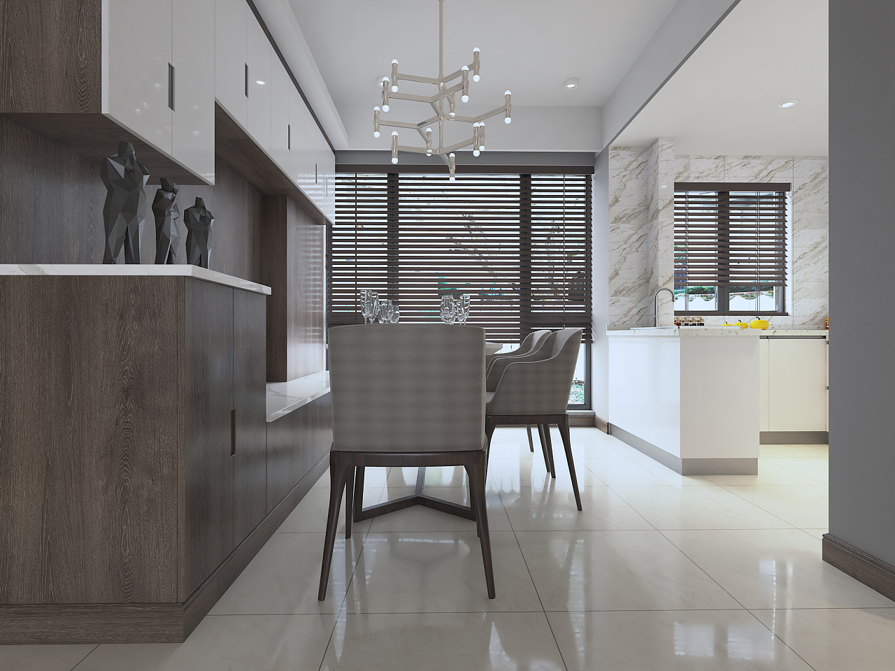 餐厅的部分座位巧妙的与背景柜进行了结合,利用柜体的本身充当座位,同时其余空间可以继续作为收纳空间进行使用。