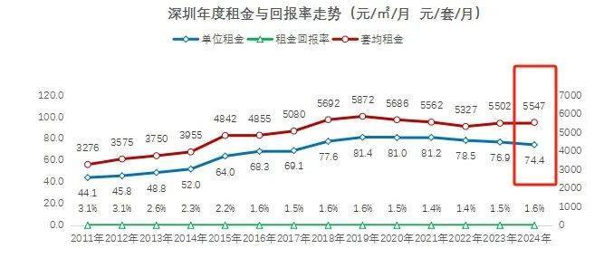 聚焦到深圳来看,2024年的年平均租金为74.4元/㎡/月,甚至低于2018年77.6元/㎡/月的租金水平,创下了近7年新低。