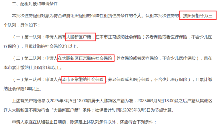 大鹏则以户籍、社保情况作为条件,将认租群体分成三队列,具有大鹏户籍、累计缴纳3年及以上社保的群体属于具有优先级的第一队列;申请条件的社保缴纳年限需1年以上。