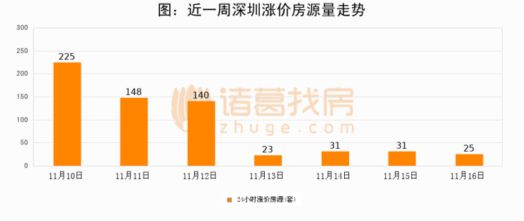 根据诸葛找房数据显示,深圳24小时涨价房源量为25套,较11月15日减少6套,环比下降19.4%。与此同时,涨价房源占比小幅回落,对于购房者来说是一个入市窗口期,购房者可抓住时机入市。