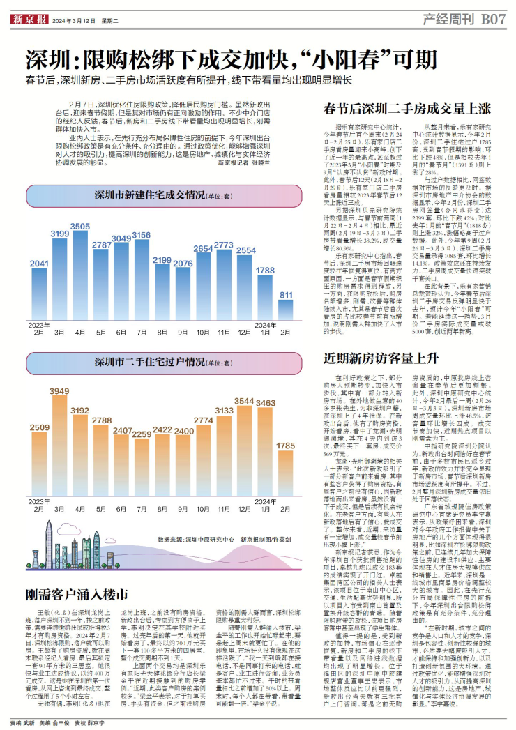 2月7日,深圳优化住房限购政策,降低居民购房门槛。虽然新政出台后,迎来春节假期,但是其对市场仍有正向激励的作用。不少中介门店的经纪人反馈,春节后,新房和二手房线下带看量均出现明显增长,刚需群体加快入市。