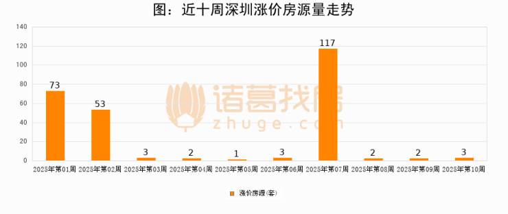 从调价房源来看,第10周深圳涨价房源3套,较上周上涨50%。与此同时,10周涨价房源占比提升3.89个百分点,业主信心持续恢复。