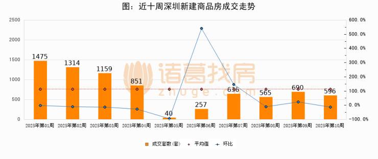 进入2025年第10周(03月03日-03月09日),深圳新建商品房成交596套,较上周减少94套,环比下降13.6%