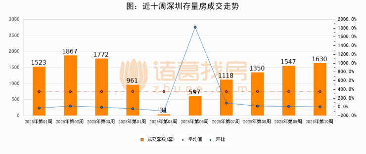 存量房方面,第10周深圳存量房成交1630套,较上周增加83套,环比上涨5.4%。从近十周成交走势来看,周均成交套数为1239套,本周高于平均水平31.6%。