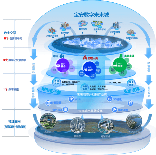 宝安数字未来城将智慧智能作为城市的基础和标配,以数字化转型整体驱动城市生产方式、生活方式和治理方式变革,构建数字空间和物理空间“同生共长、同频谐振”的城市智慧生命体。